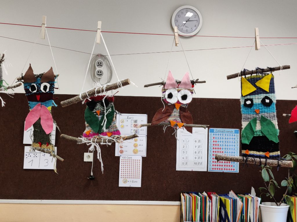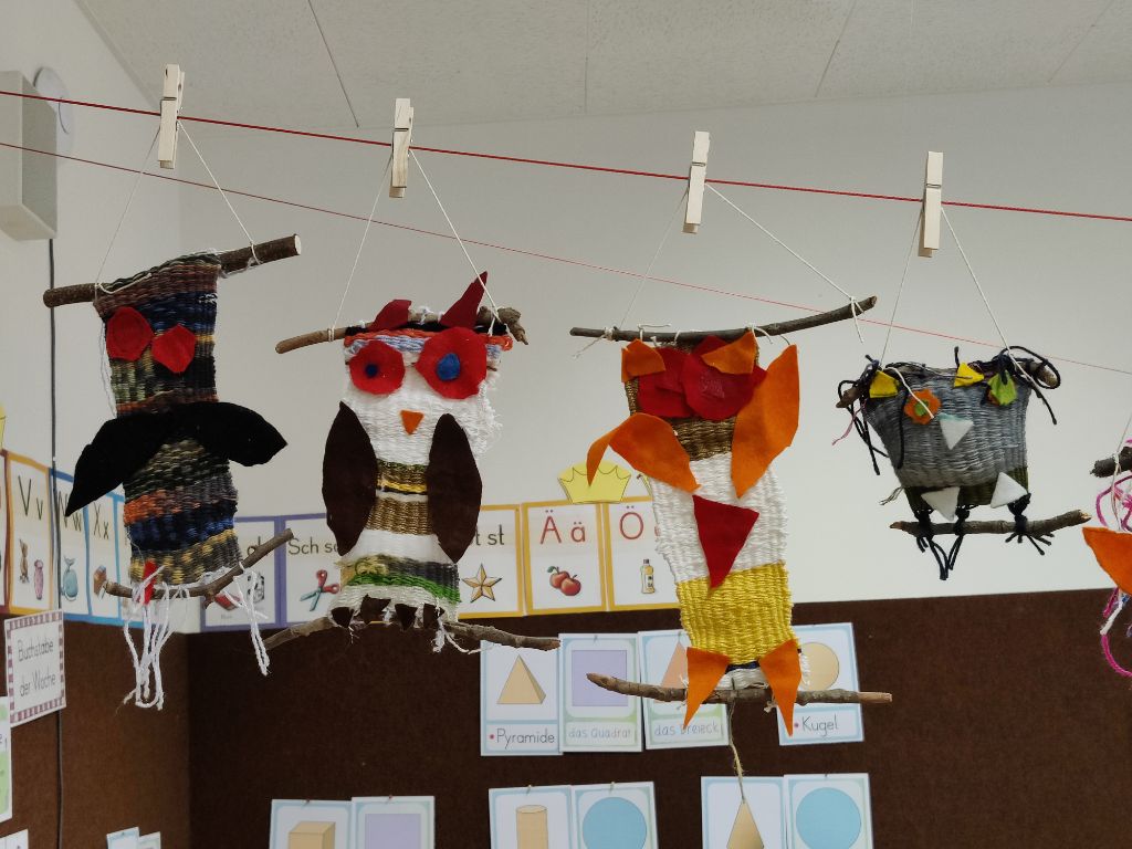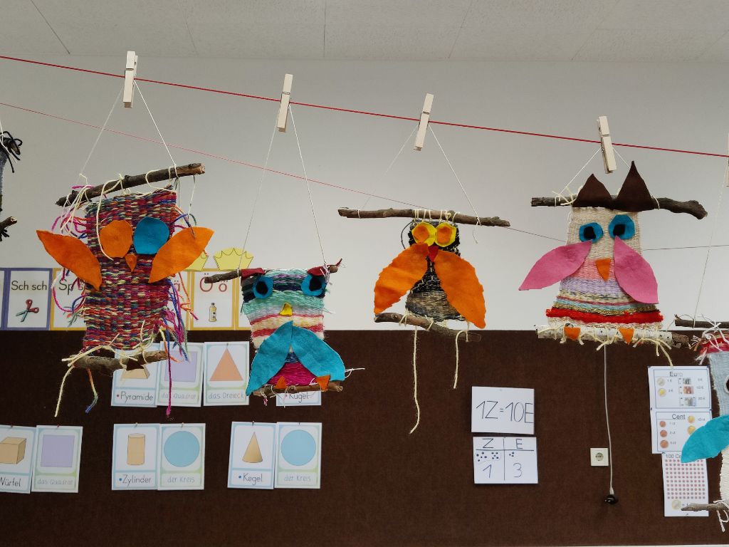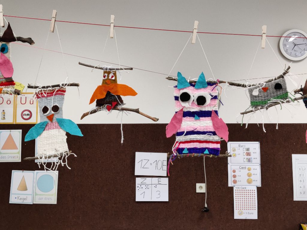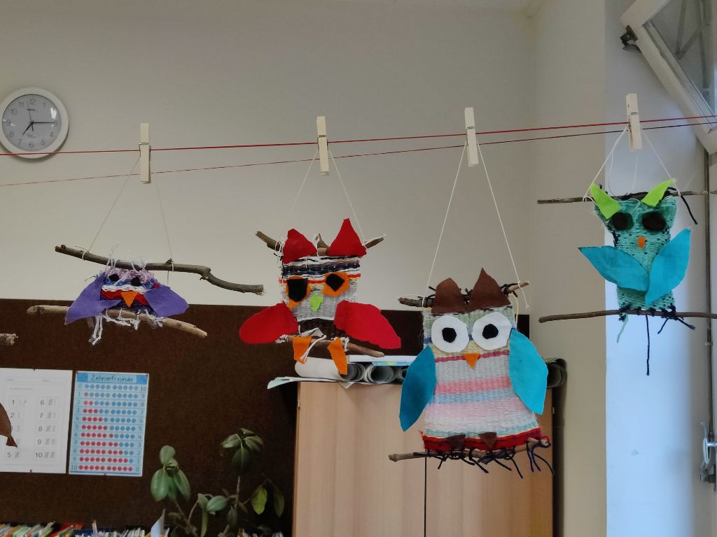 Die Klasse 1c hat in mühevoller und intensiver Arbeit Eulen aus gewebter Wolle und Filz hergestellt. Zuerst wurde mithilfe eines Webrahmens und vieler bunter Wolle ein Webteppich hergestellt. Dieser wurde an selbstgesammelte Äste geknotet. Zum Schluss wurden noch Körperteile aus Filz ausgeschnitten und aufgeklebt. Die Kinder sind sehr stolz auf ihre Arbeit.