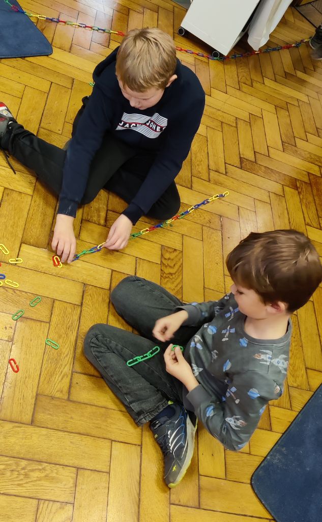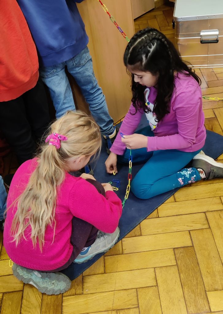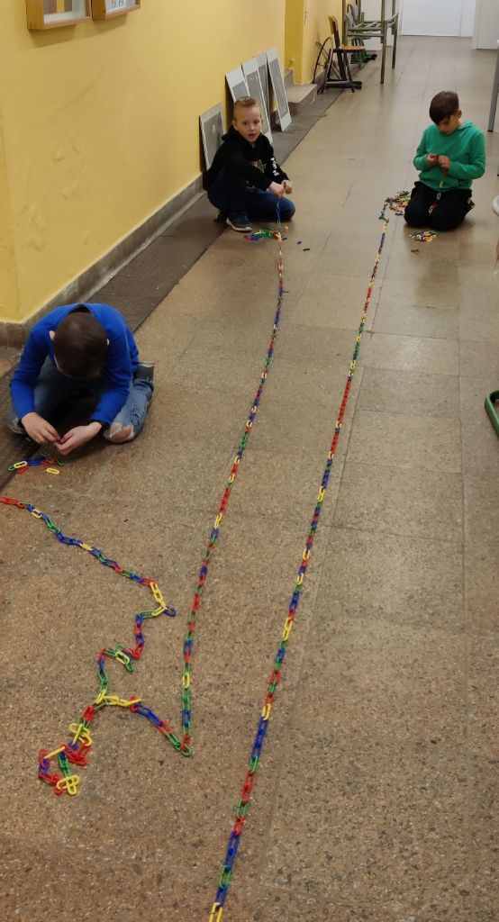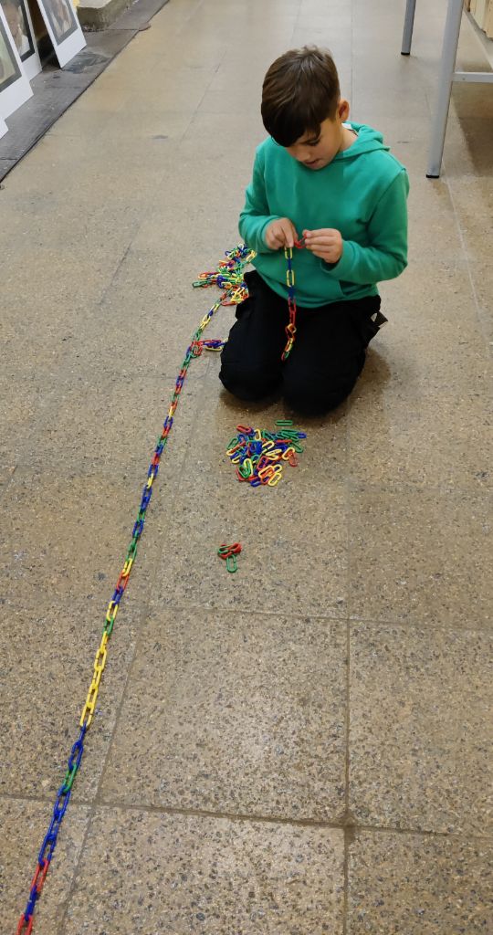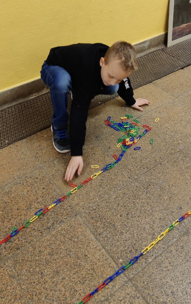 Die Klasse 2c hatte viel Freude daran zu schätzen, zu knobeln und eine lange Gliederkette zu bauen. Hierfür haben die Kinder zusammengearbeitet, um die Kette immer weiter zu verlängern. Nachdem aus vielen kürzeren Ketten eine gemacht wurde, reichte sie sogar bis ins nächste Stockwerk. Andere Klassen konnten eine Kette bauen, die komplett durch das ganze Treppenhaus reichte.